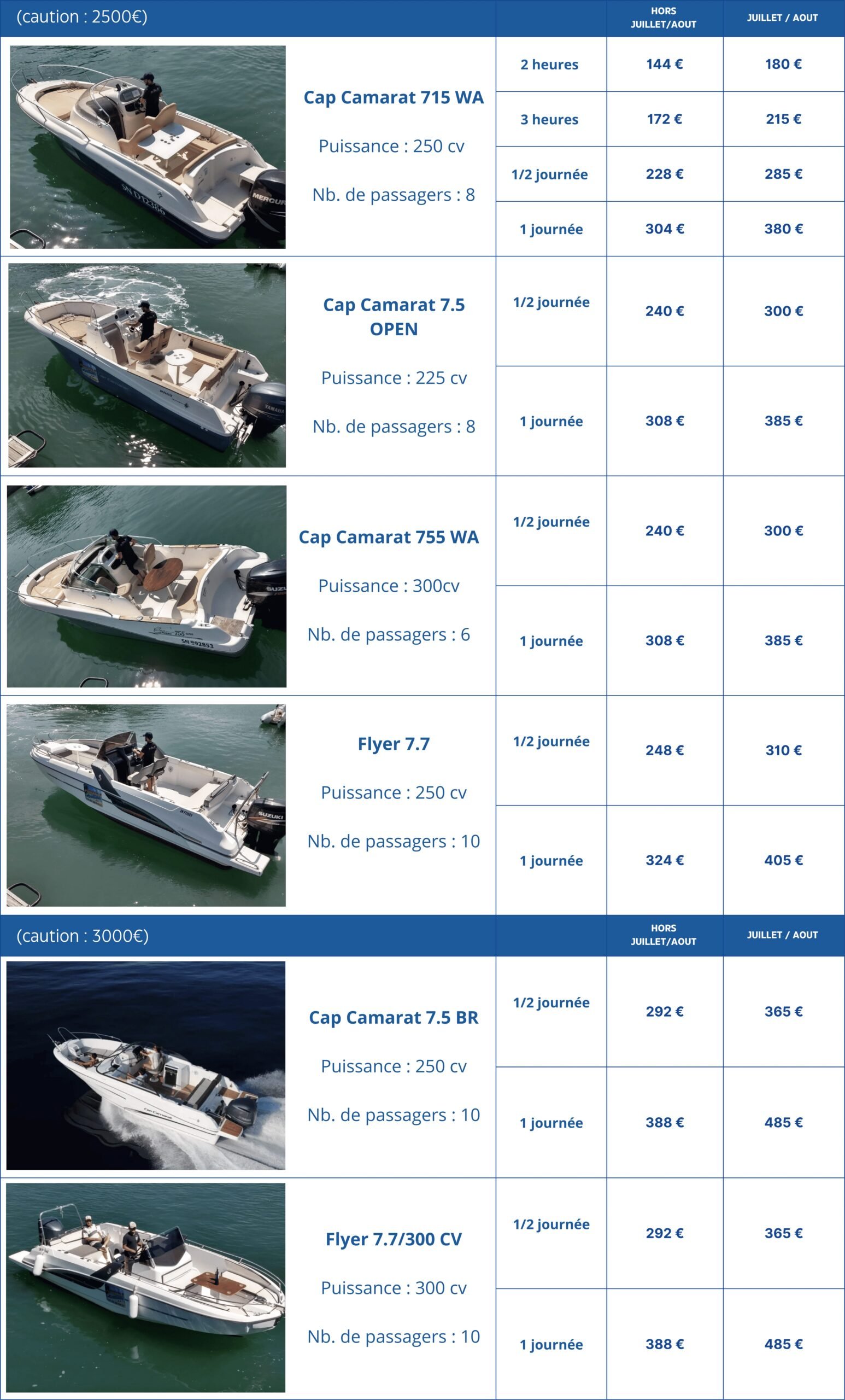 • Le carburant est en supplément pour les bateaux avec permis.